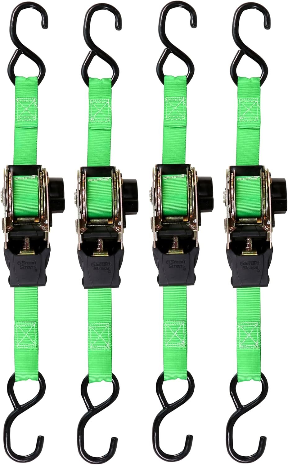 - GREEN MEANS STANDARD DUTY: Strong, non-marring coated steel S-hooks with a break strength of 1,500lbs. This 4 pack of 6-foot long self-retracting ratchet straps have a safe work load of 500lbs each, keep your cargo secure during transport.